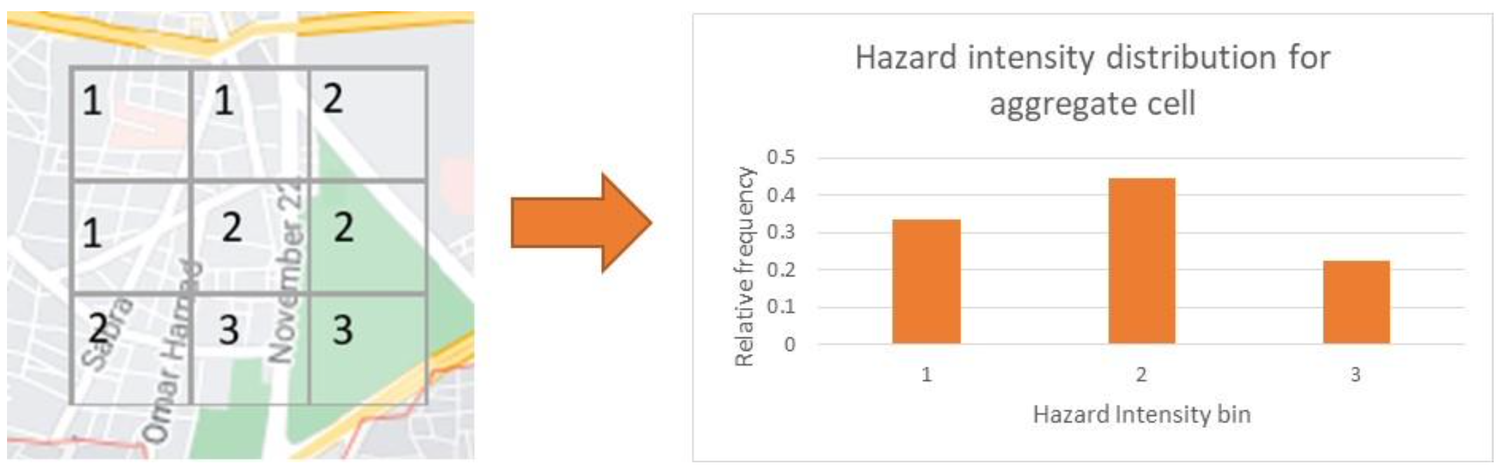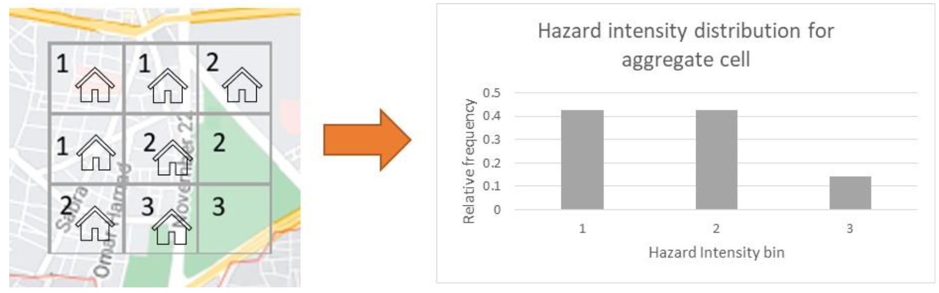 As an example, taking a hypothetical area grid which contains 9 smaller grid cells. Each small grid cell contains a hazard intensity value, represented here by bin index 1, 2 or 3. A hazard intensity distribution can be created for the large area grid by binning the hazard values of the 9 grid cells.
