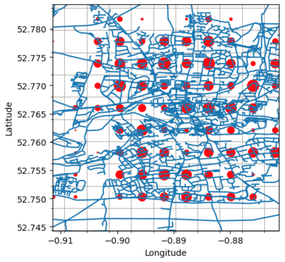 locations that share that post code. Each red dot below represents a group, where the radius is proportional to the weight: