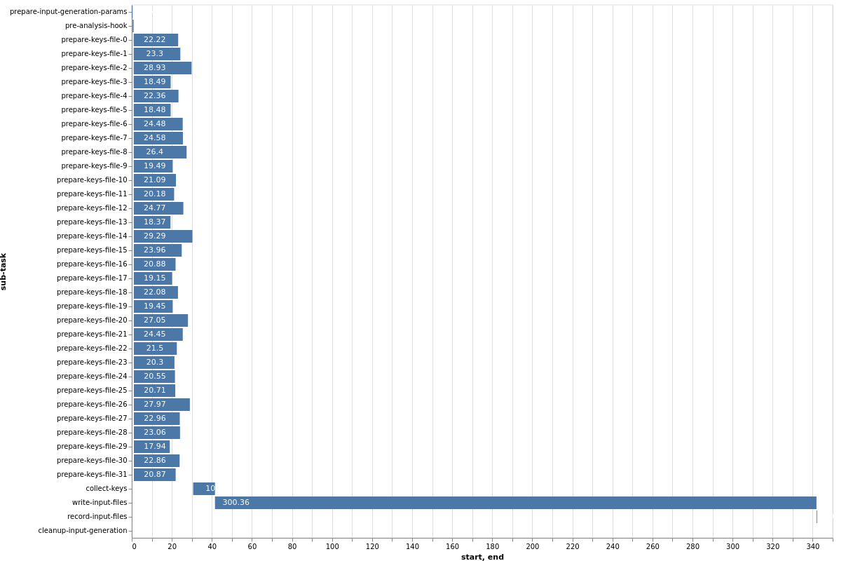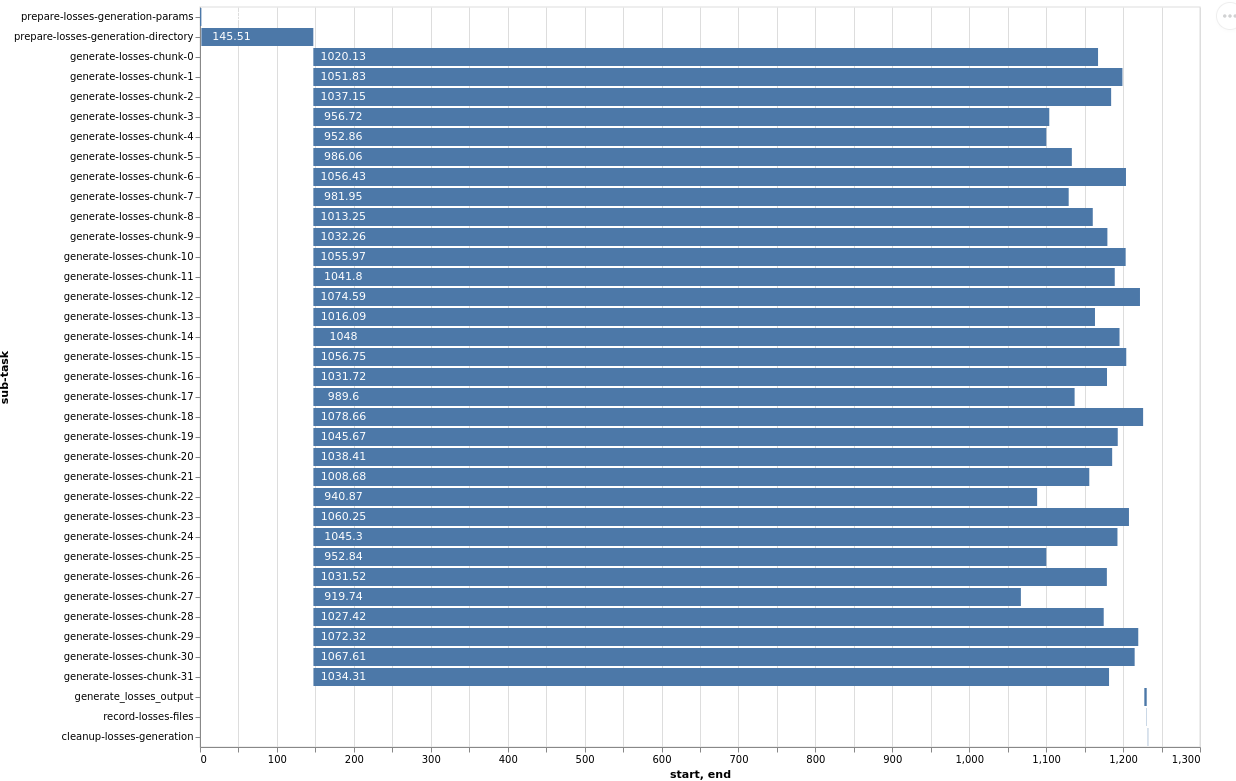 This Gantt chart illustrates an example where 32 ‘lookup chunks’ run concurrently, completing in approximately 25 seconds. However, the overall task duration is bottlenecked by the subsequent sequential step of generating and writing the intermediate Oasis files, which takes around 300 seconds. In this scenario, allocating more computational resources to the parallel lookup chunks would yield little to no overall speedup, as the un-distributed, sequential file writing becomes the dominant factor.