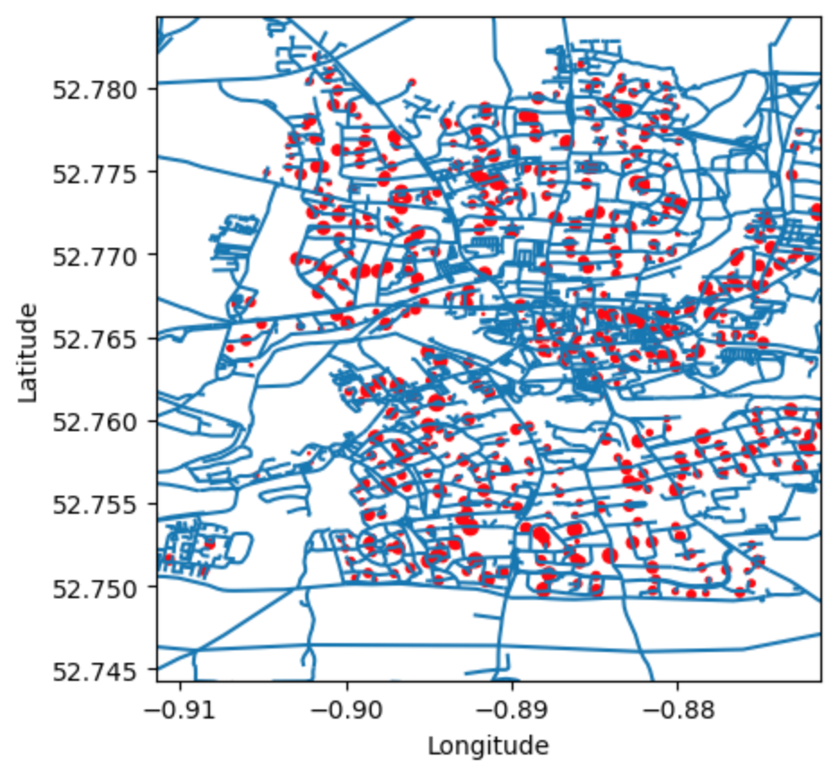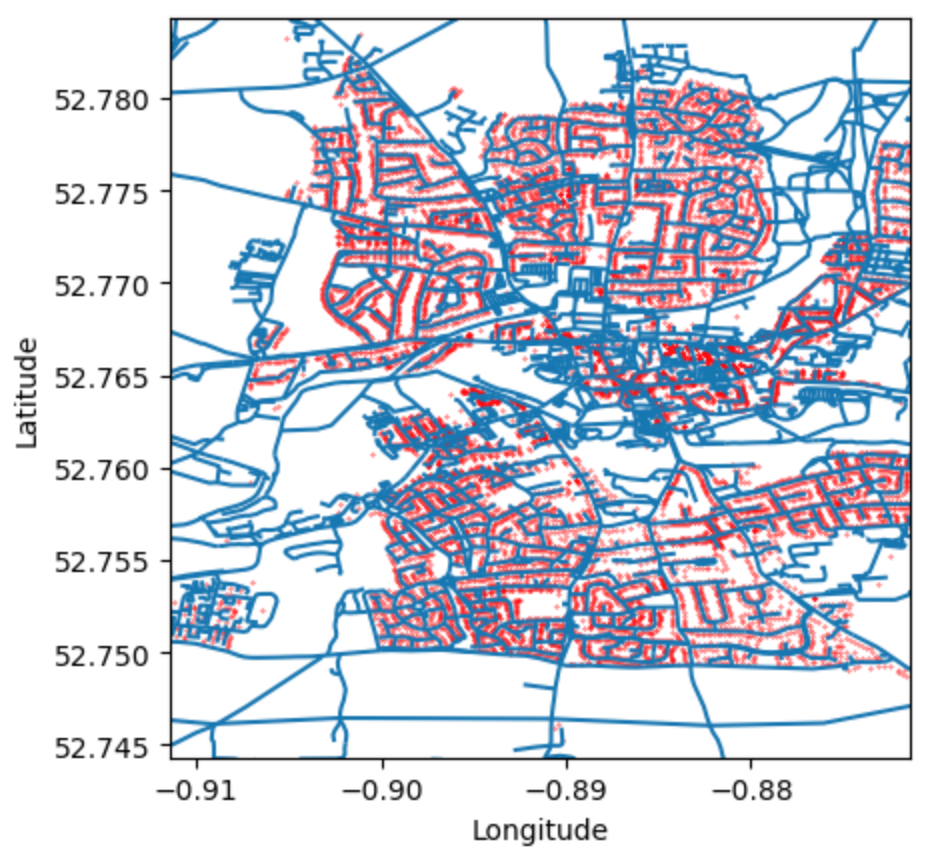 This example creates amplification IDs based on the post code of the properties in the model. Each location is represented by a red dot: