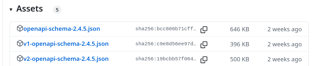 On each release of the Oasis Platform, all three of these API versions are published as OpenAPI specification files and attached to the corresponding GitHub release page for download